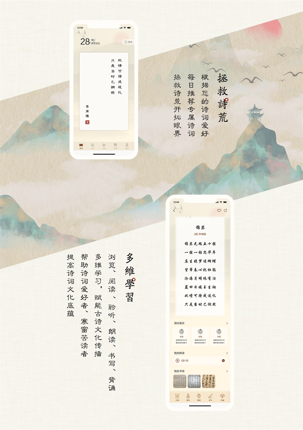 一款古诗词、古文、书画等学习工具和丰富的原创内容社区。可以设置经典诗词、文库分类和诗单收藏为自己的学习计划,每天有计划的打卡学习